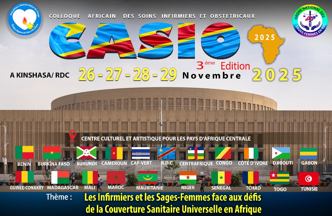 La 3e édition du colloque africain des soins infirmiers et obstétricaux se tiendra à Kinshasa (RDC) les 26,27,28 et 29 novembre 2025, au Centre culturel et artistique pour les pays d’Afrique centrale.